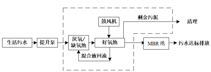污水经过接触氧化后,夹带氧化过程中产生的少量的活性污泥及新陈代谢脱落的生物膜,以及不能进行生物降解的少量固形物,进入MBR池进行固液分离,使水得到澄清排出。沉淀的污泥全部回流至厌氧池作进一步消化减少剩余污泥。