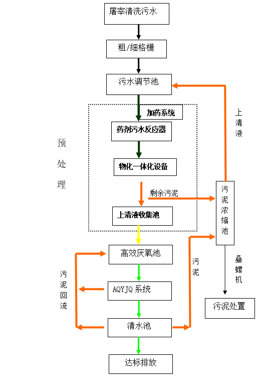 在屠宰和肉类加工的过程中,要耗用大量的水,同时又要排除含有血污、油脂、毛、肉屑、畜禽内脏杂物、未消化的食料和粪便等污染物质的废水,而且此类废水中还含有大量对人类健康有害的微生物。肉类加工废水如不经处理直接排放,会对水环境造成严重污染。屠宰厂杀猪废水中血主要含有液、油脂、碎肉、骨渣、毛及粪便等,废水呈褐红色,具有较强的腥臭味水量大、排水不均匀、浓度高、杂质和悬浮物多等特点,同时该类污水水质变化较快,放置一段时间后水解酸化严重,解决水污染和节水问题的最好途径是将污水收集后快速处理,在污水没有变质的情况下将污水中的大部分污染物去除。然后再经过生化处理后出水稳定的达标。这样不仅处理成本低,处理效率高,而且经过前端的物化预处理后整个项目的占地面积也会大大的减少。